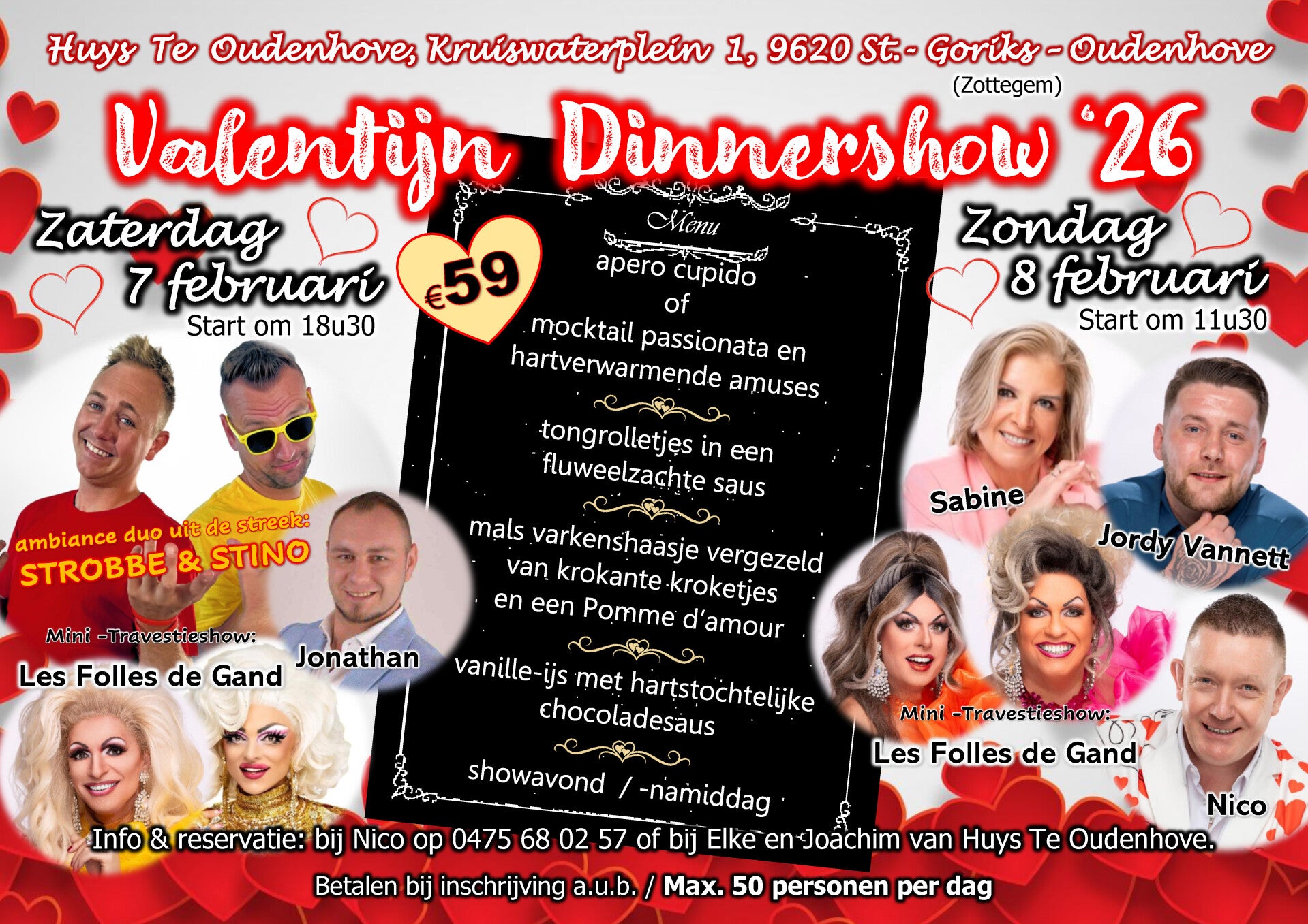 U kan hier reserveren voor de Valentijn dinnershow op zaterdag 7 en/of zondag 8 feb. in het pitoreske St.-Goriks-Oudenhove (Zottegem) in het super gezellige Huys Te Oudenhove bij Elke & Joachim aan slechts €59,00/persoon. Opgelet: max. 50 personen/dag.